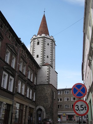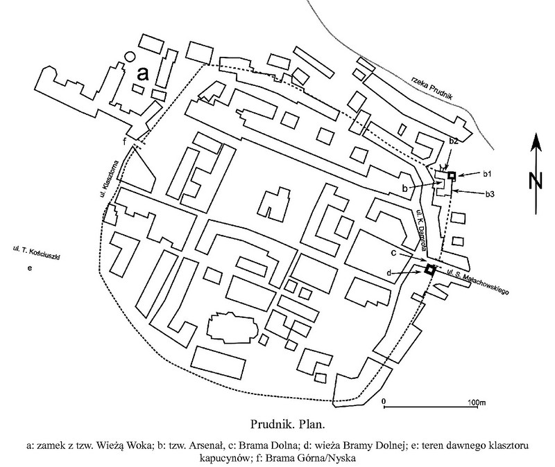 i Bramie Górnej/Nyskiej znajdowały się flankujące przejazd wieże. Narożnik północno - zachodni miasta zajmowało zaś założenie zamkowe.