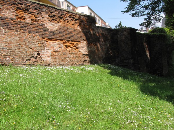 Rożna jest również grubość partii ceglanych muru. W części północnej mają grubość jednej